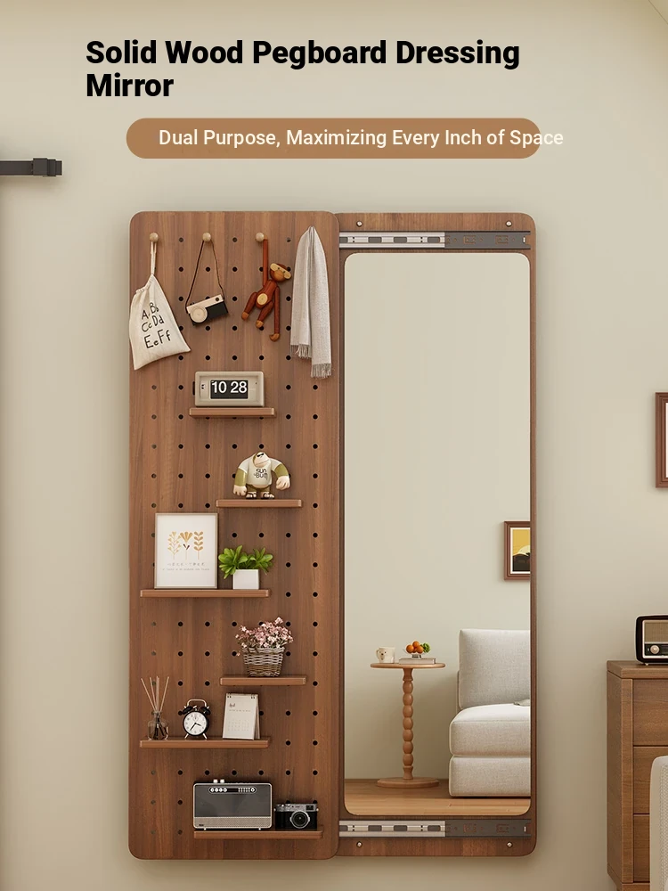 Solid Wood Pegboard Full-Length Mirror with Hidden Sliding Door - Perfect for Entryways, Space-Saving Design, Slimming Effect, Ideal for Home Use.