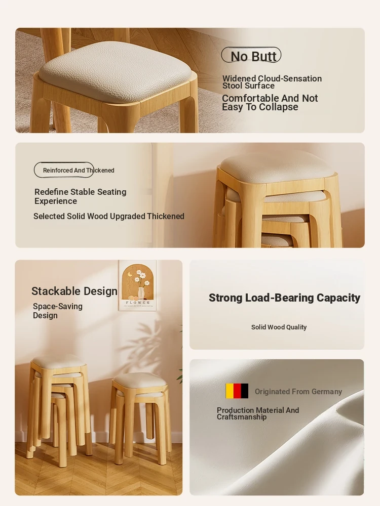 Durable Solid Wood Stacking Stool with Soft Cushion - Versatile Small Square Bench for Dining Room or Living Room, Perfect as Extra Low Seat or Chair