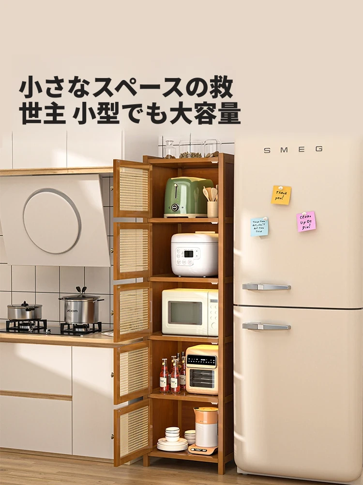 壁に寄せられるスリムなキッチンカウンターキャビネット!モダンでシンプルなデザインの多機能収納棚。リビングやキッチンにぴったりのコンパクトな収納ソリューション!おしゃれにスペースを有効活用しましょう。