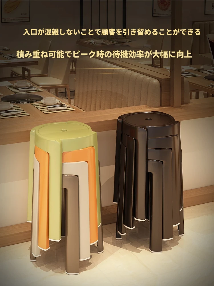 商用飲食用のスタッキング椅子|レストランやカフェの待機用に最適|丸型デザインでスペースを有効活用|プラスチック製で軽量・耐久性抜群|テーブルのサブチェアとしても便利!