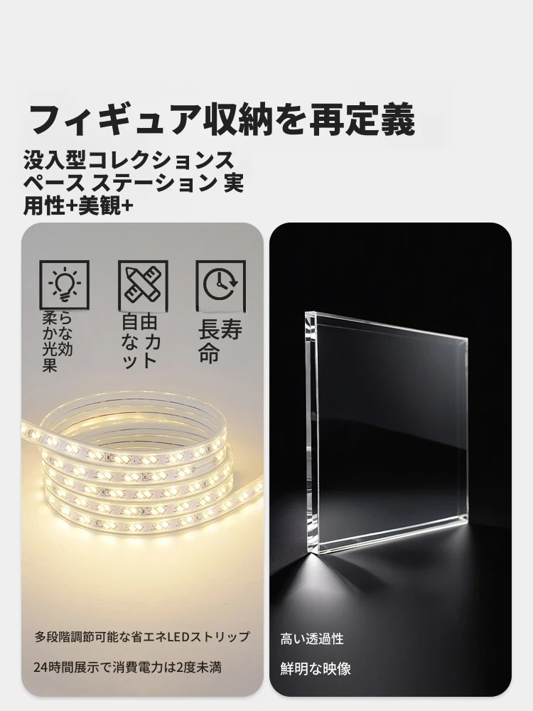 フィギュアディスプレイキャビネット - LED付きアクリル収納ケース!ブロックやドールを美しく見せる、透明なショーケースであなたのコレクションを引き立てます。完璧な組み合わせで、魅力的なインテリアを演出!