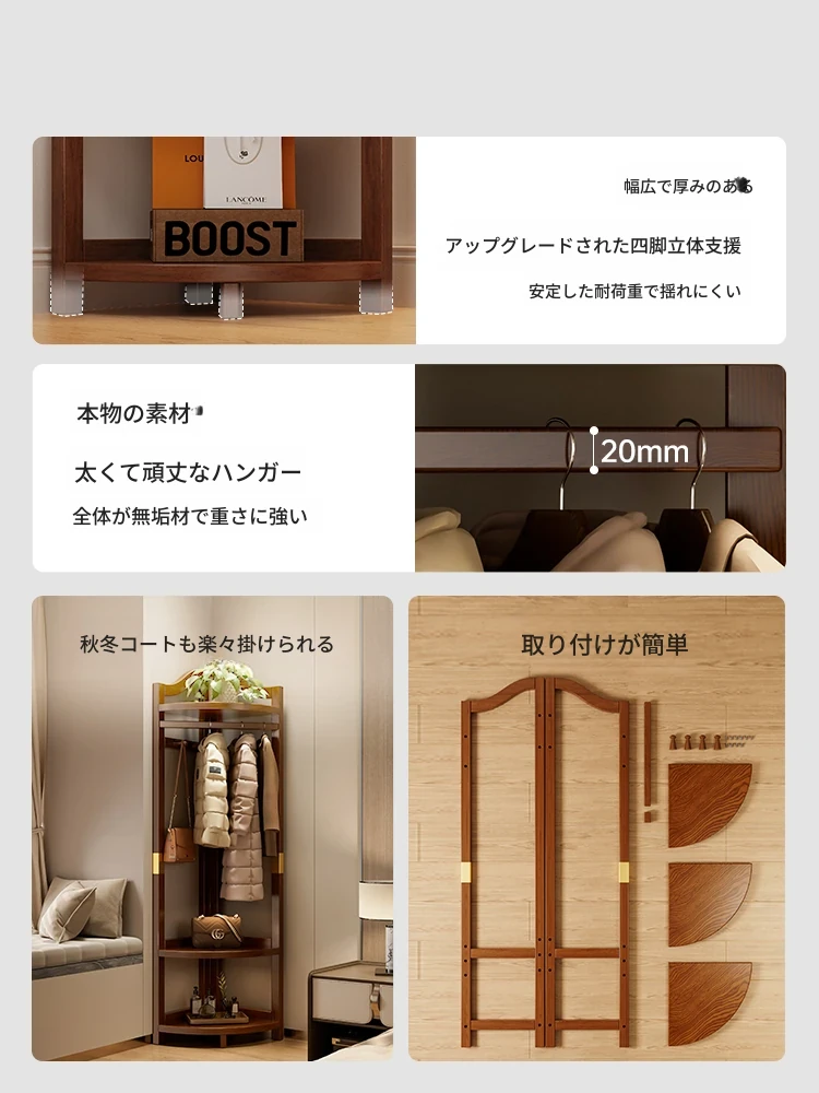 角にぴったりフィット!天然木製のスタイリッシュなコートハンガー。寝室やリビングに最適。ベッドサイドや壁の隅に置いて、脱いだ服をスマートに収納。おしゃれで機能的な収納アイテム!