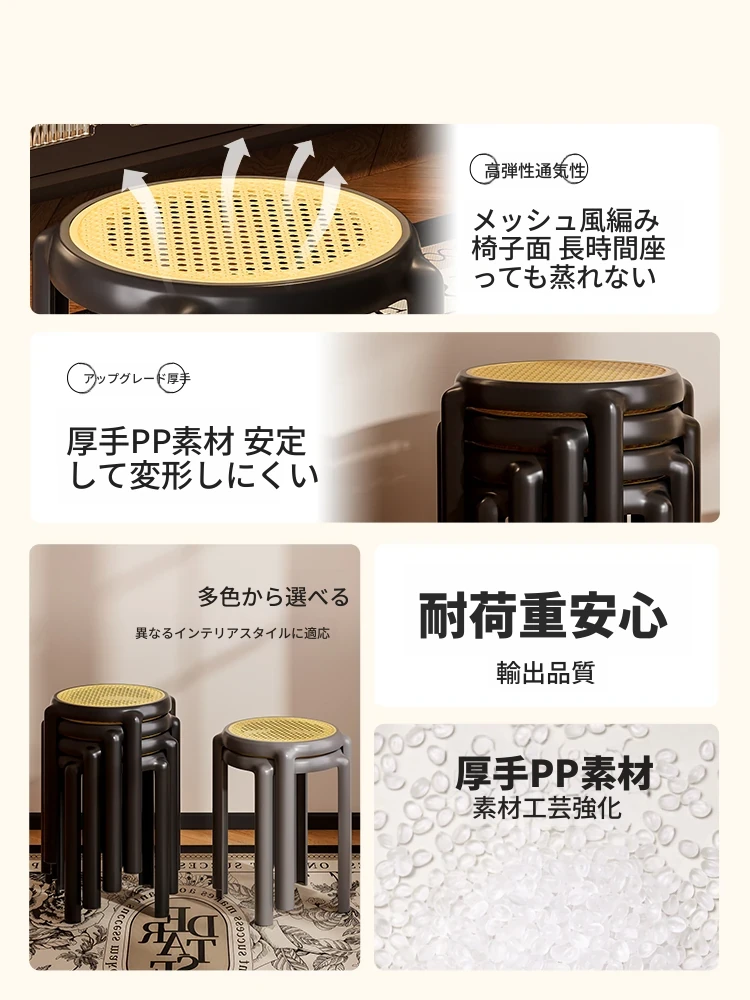 厚手のプラスチック製スタッキングスツール - モダンでシンプルなデザイン、リビングやダイニングにぴったり!ラウンド型で使いやすく、収納も便利なラタン調の高座椅子。